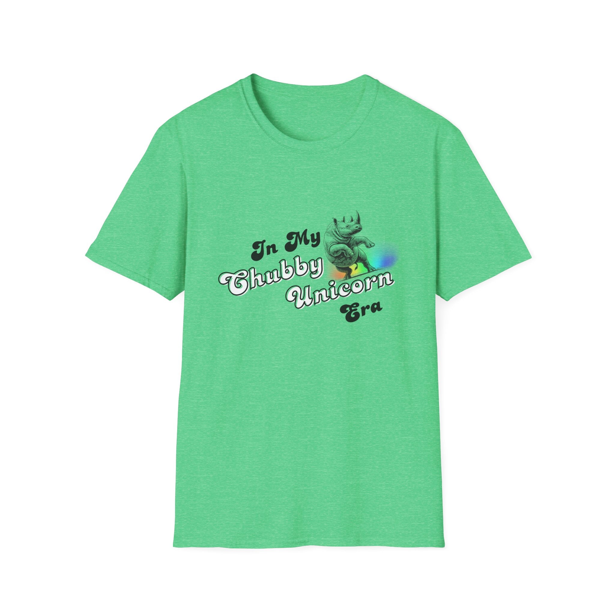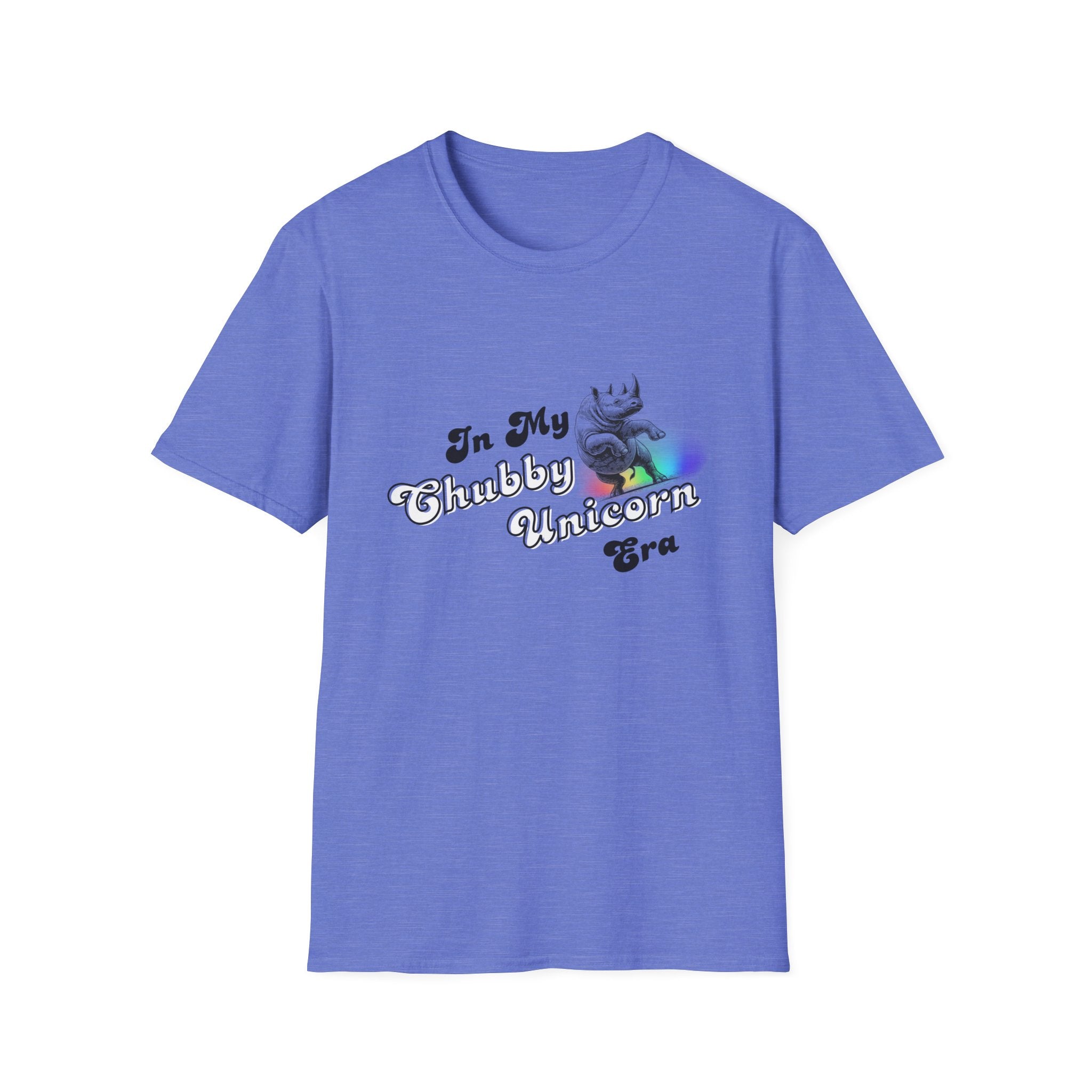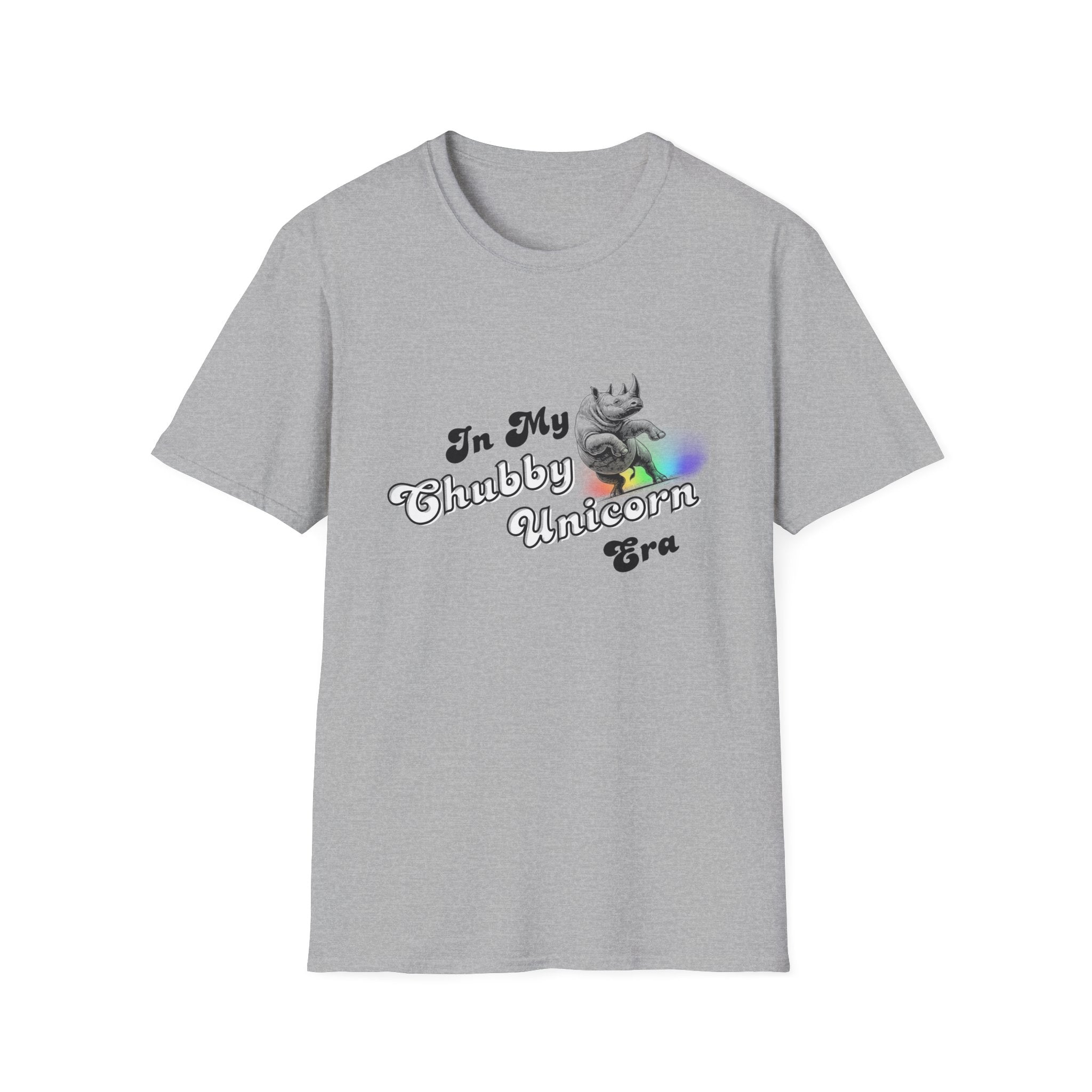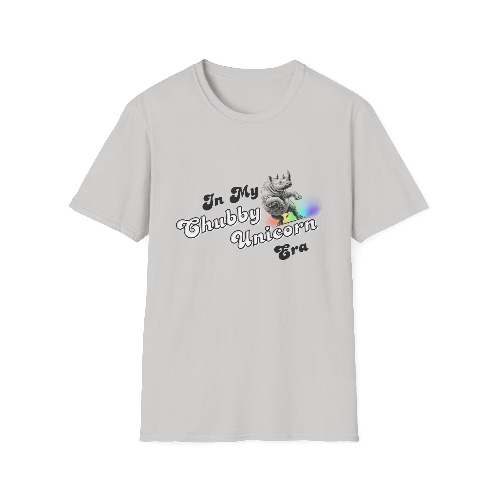 A fun and quirky T-shirt featuring an image of a dancing rhino and the text 'In My Chubby Unicorn Era'. This T-shirt exudes a playful and lighthearted vibe, perfect for those who enjoy whimsical and unique fashion. It can be a great conversation starter and a statement piece in any casual outfit. Ideal for individuals looking to add a touch of humor and personality to their wardrobe. Perfect for gifting on birthdays, holidays, or special occasions.