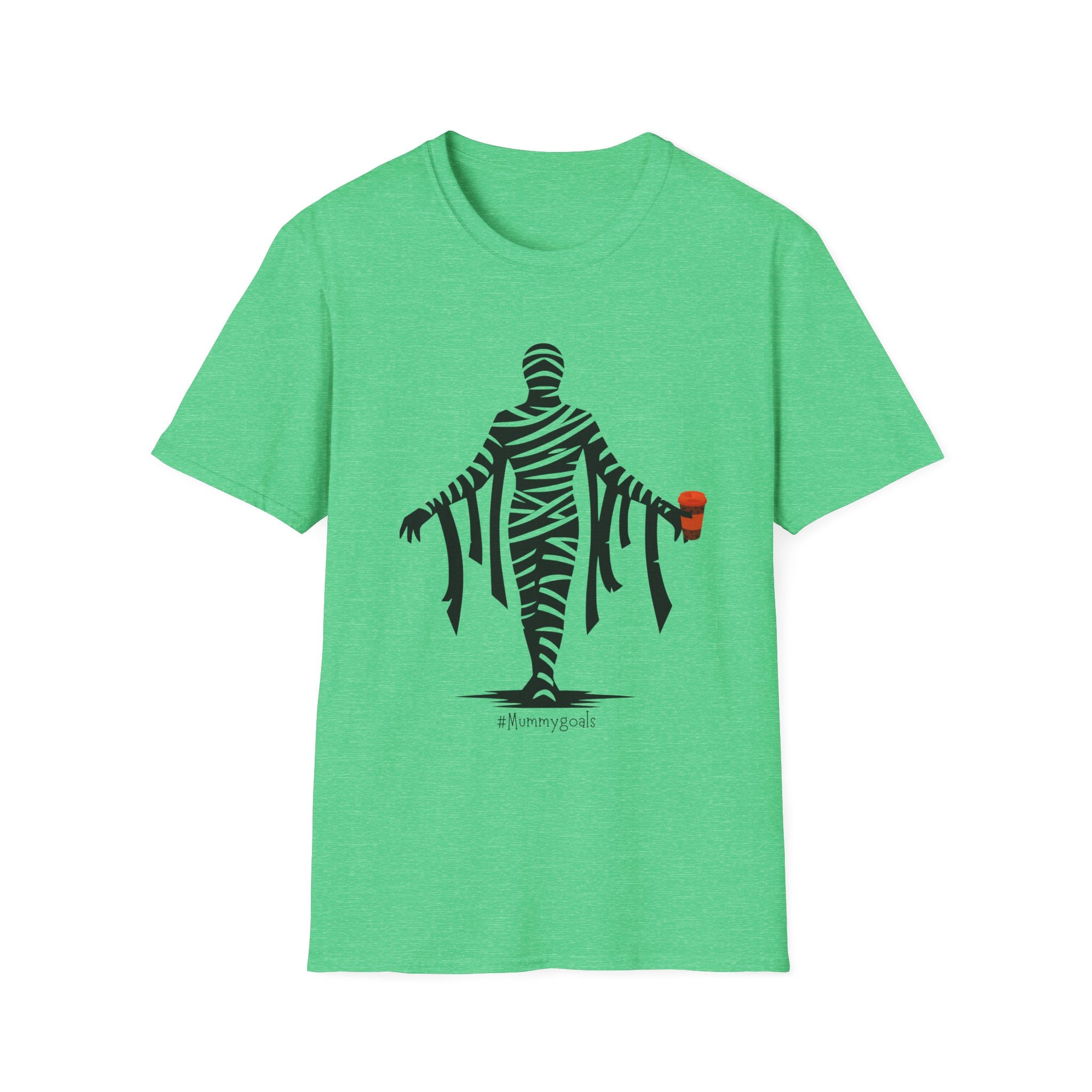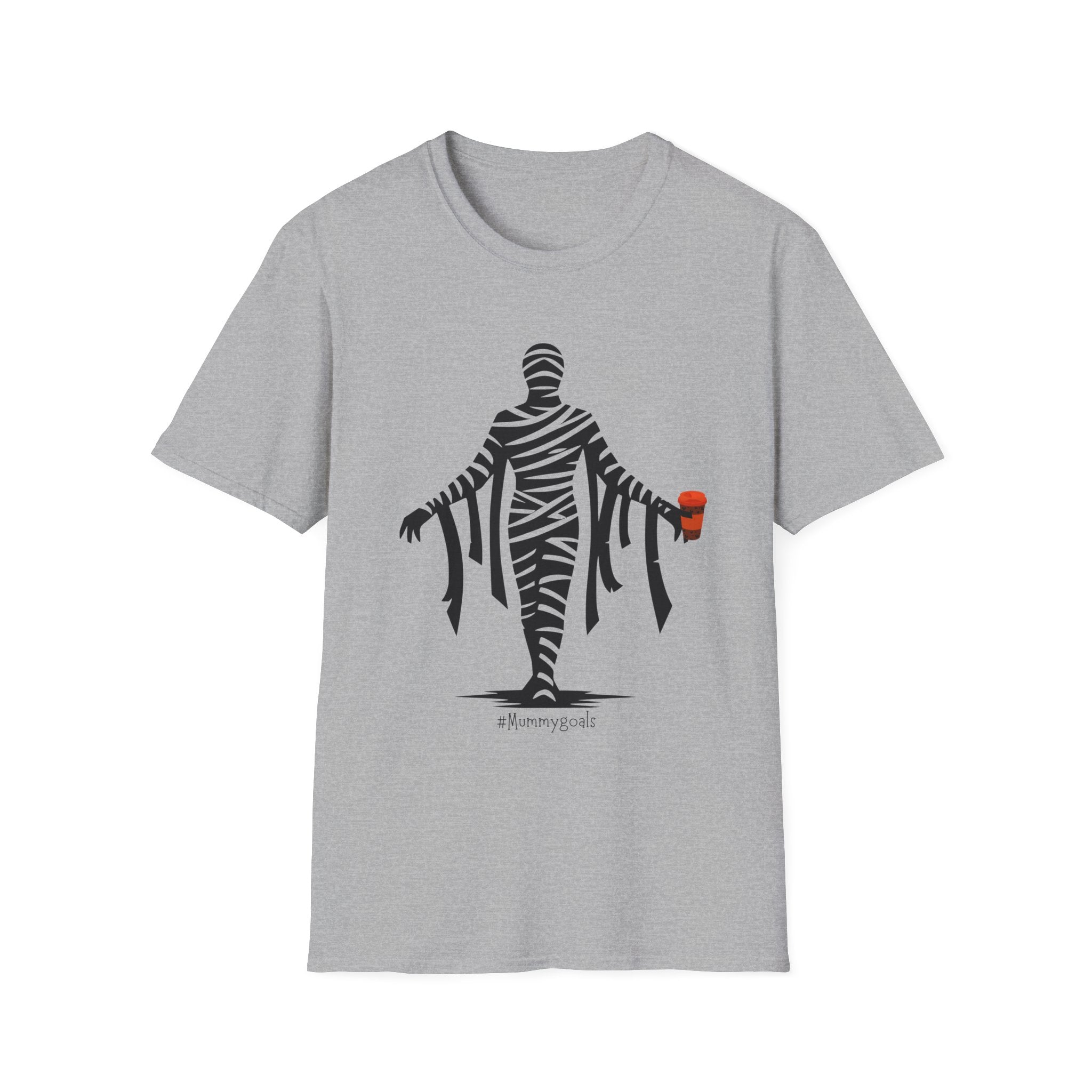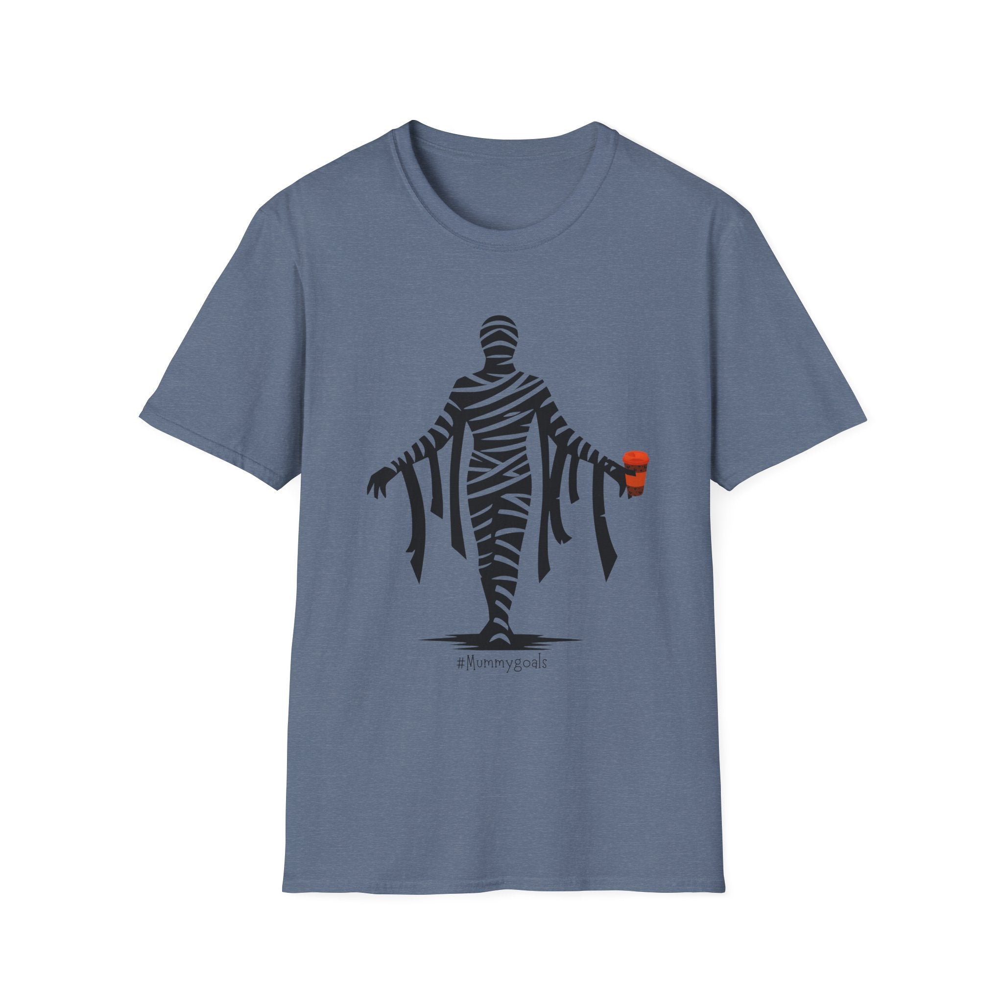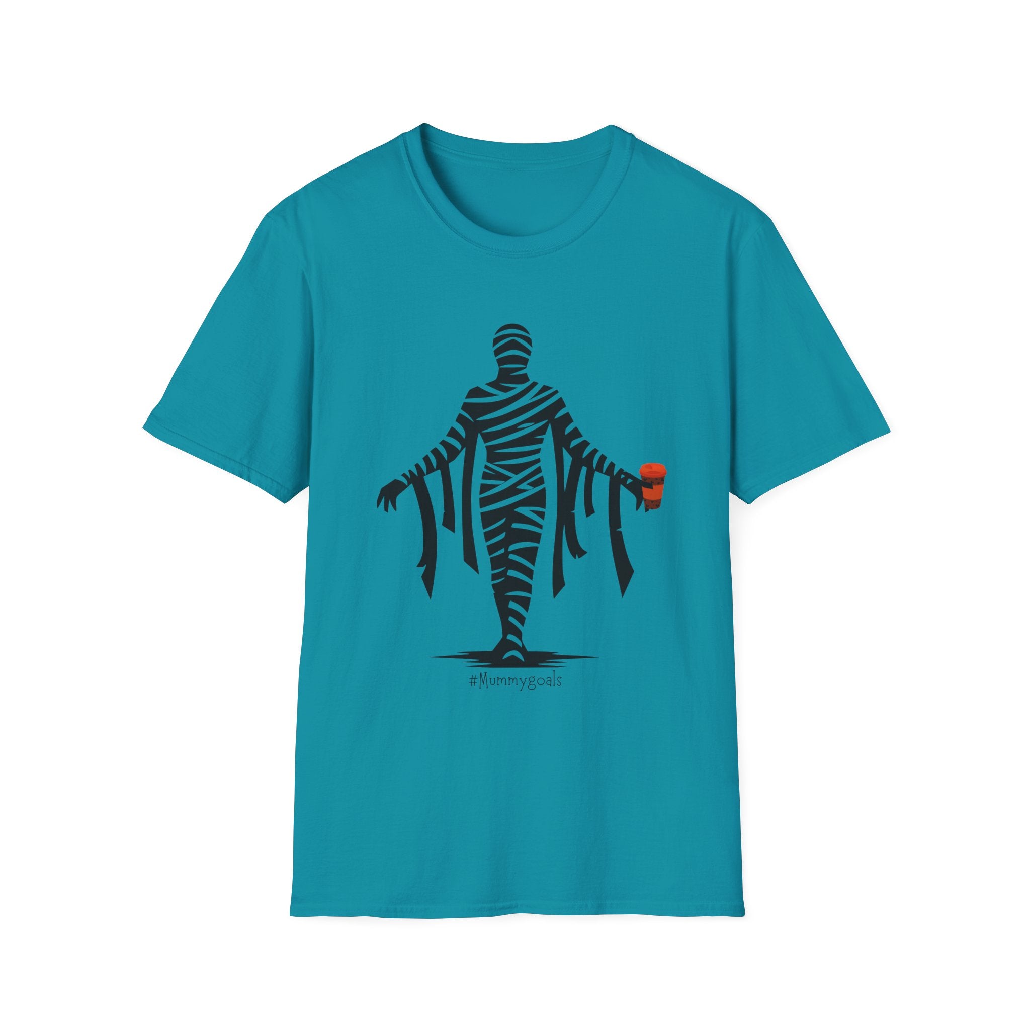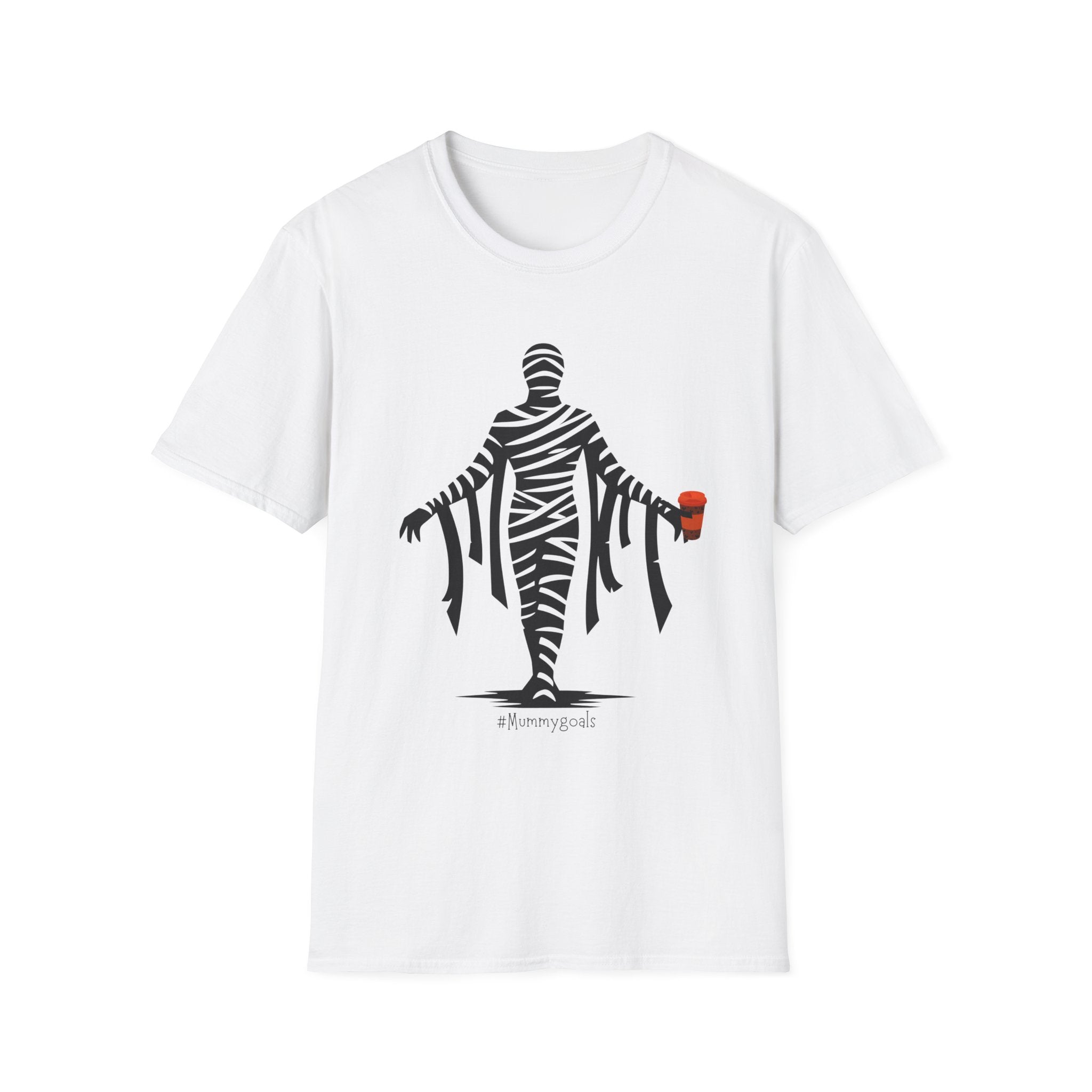 This funny T-Shirt features a picture of a mummy holding a coffee cup with the phrase "#mummy goals". It gives off a playful and humorous vibe, perfect for those who enjoy a good laugh. This T-Shirt is perfect for coffee lovers and moms alike, making it a great gift for Mother's Day, Halloween, or birthdays.