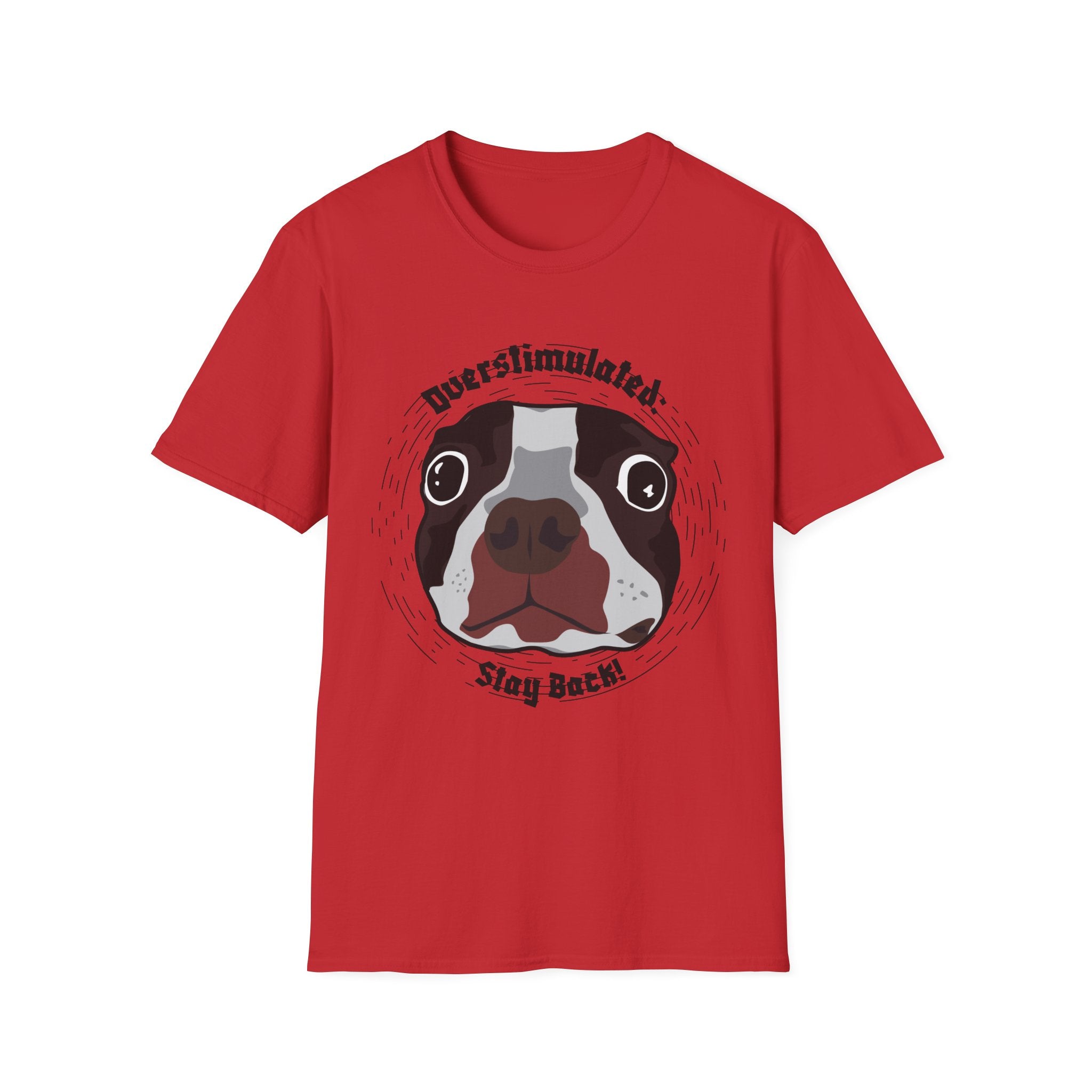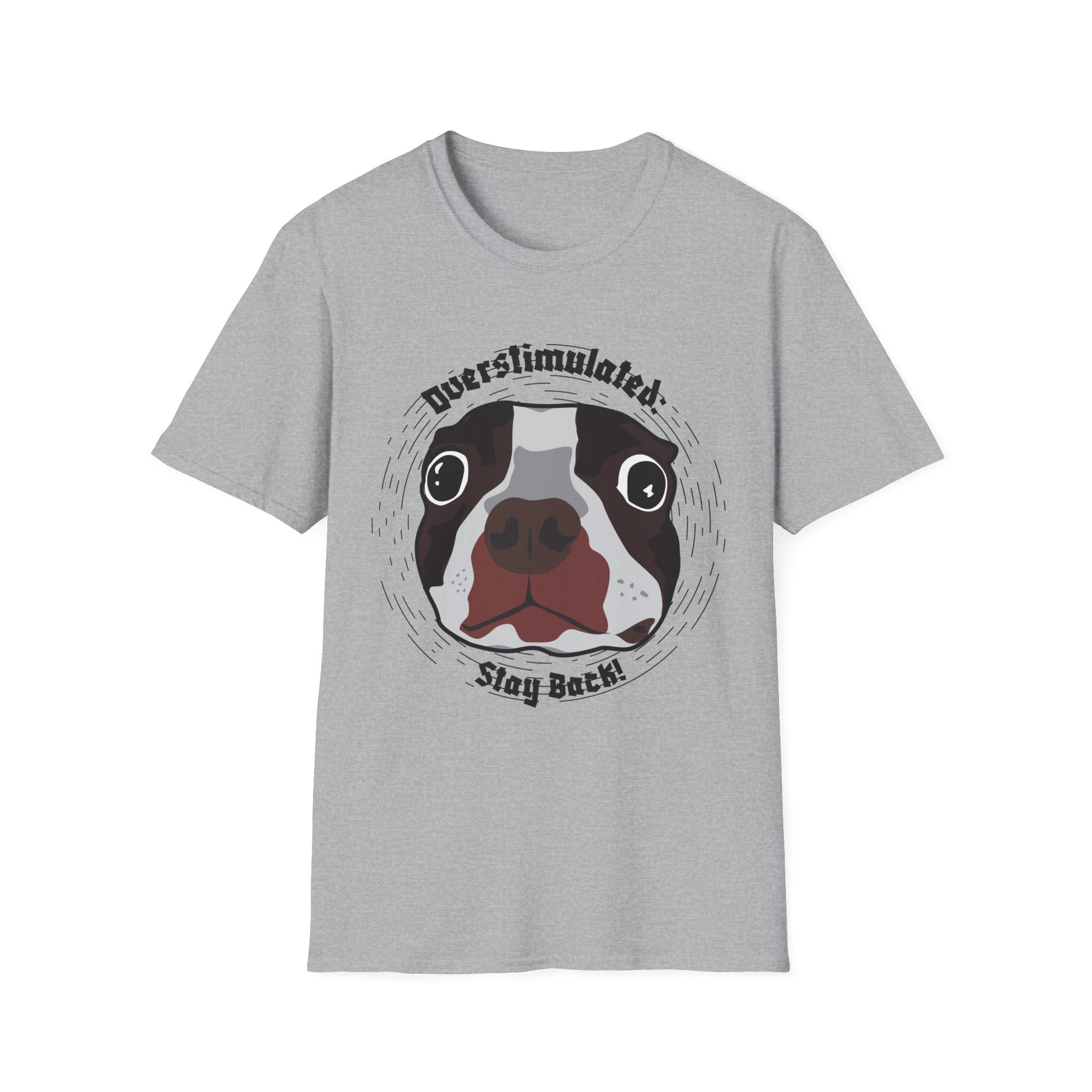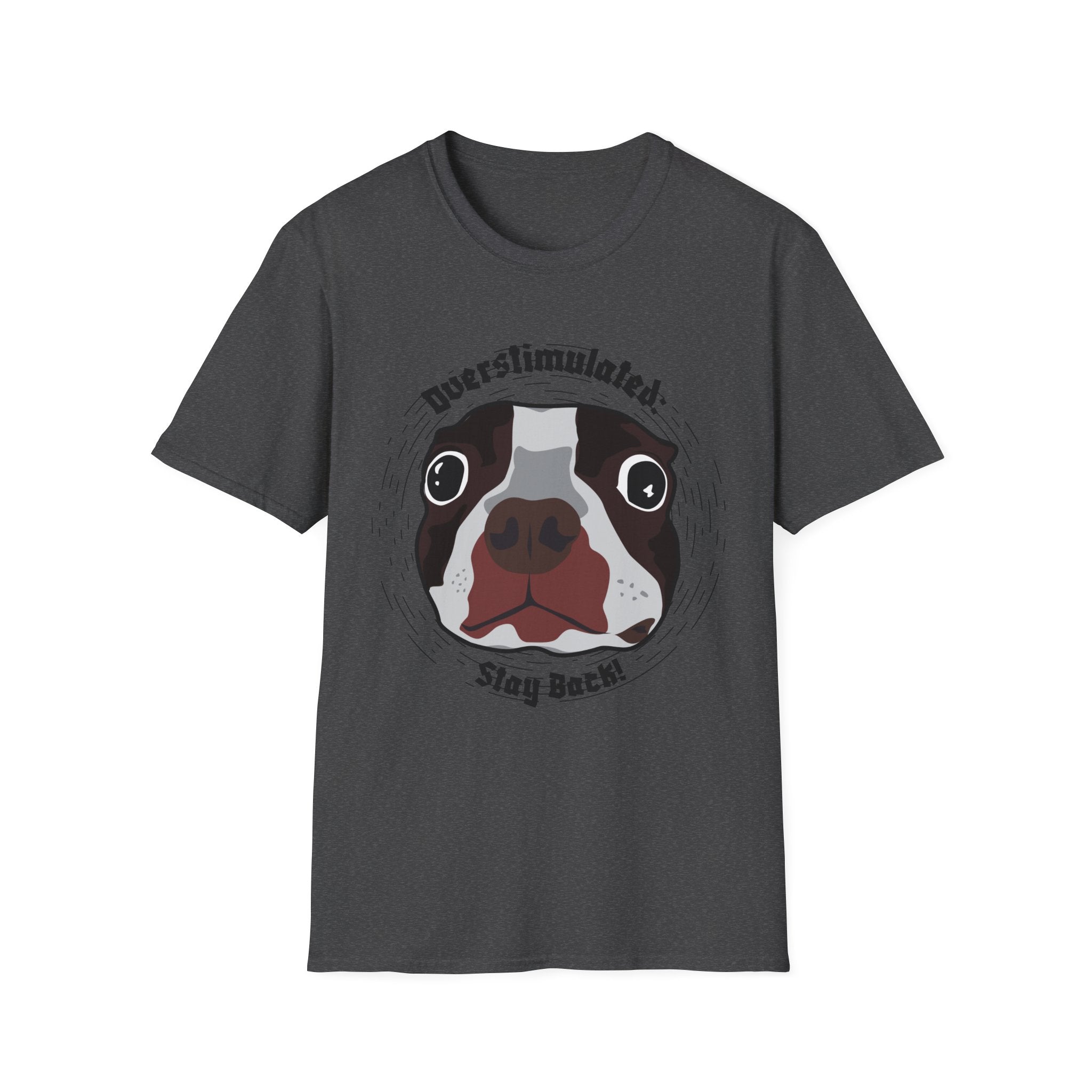 A crazed dog design with text that reads: "Overstimulated, Stay Back". This unisex softstyle t-shirt is made from 100% ring-spun cotton, providing a lightweight and durable fabric perfect for printing. The classic fit and crew neckline offer a versatile style suitable for any occasion. It features without side seams, ribbed knit collar, shoulder tape, and ethically grown and harvested US cotton.