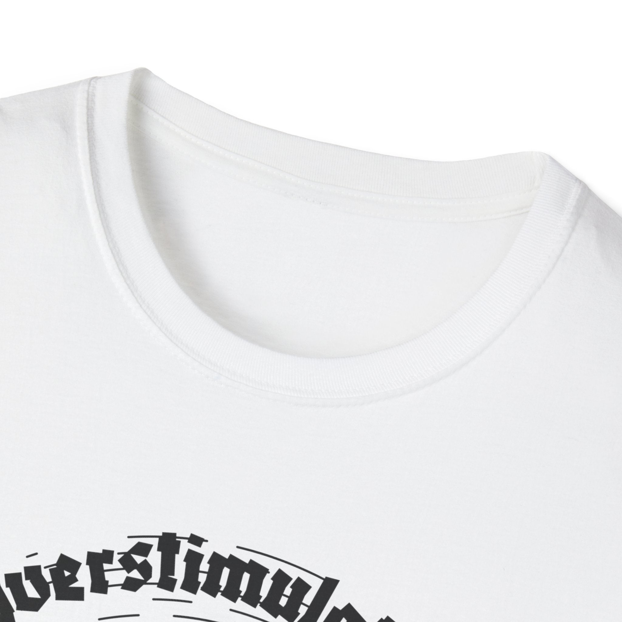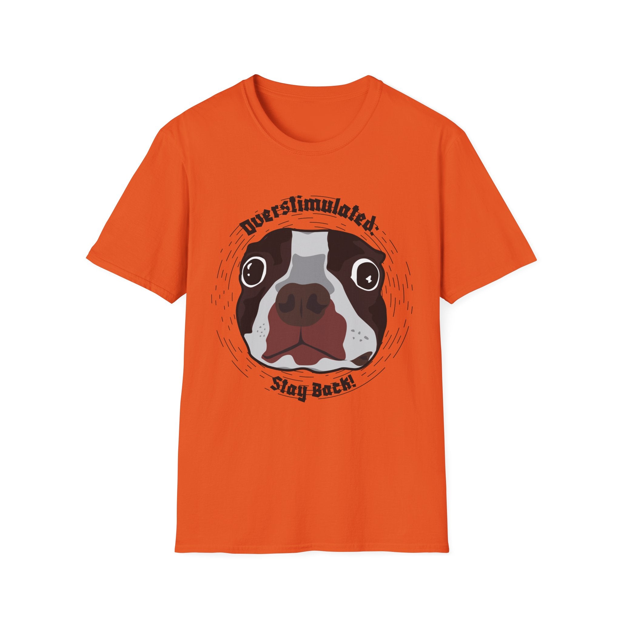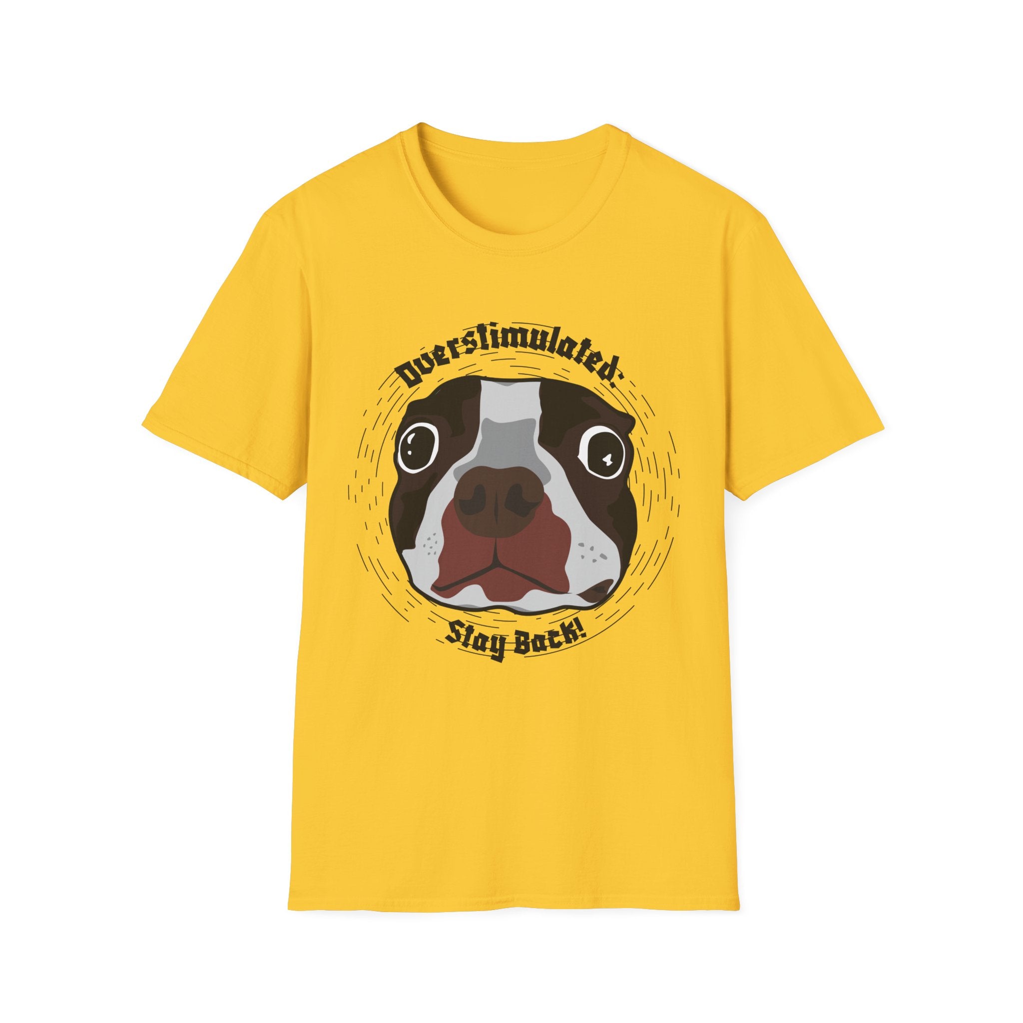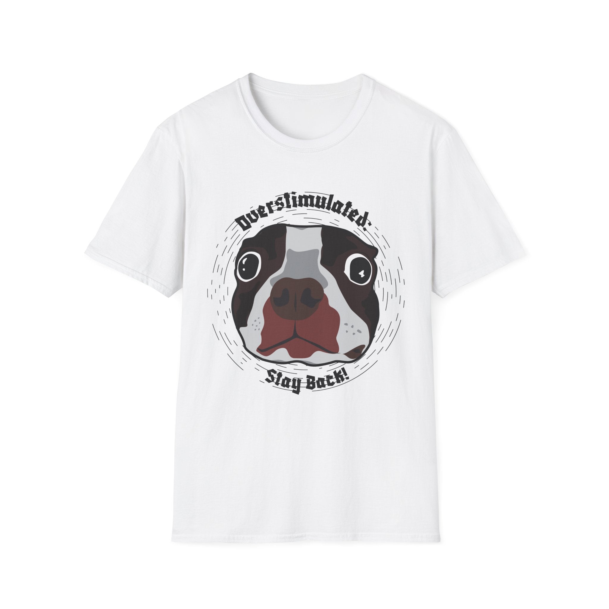 A crazed dog design with text that reads: "Overstimulated, Stay Back". This unisex softstyle t-shirt is made from 100% ring-spun cotton, providing a lightweight and durable fabric perfect for printing. The classic fit and crew neckline offer a versatile style suitable for any occasion. It features without side seams, ribbed knit collar, shoulder tape, and ethically grown and harvested US cotton.