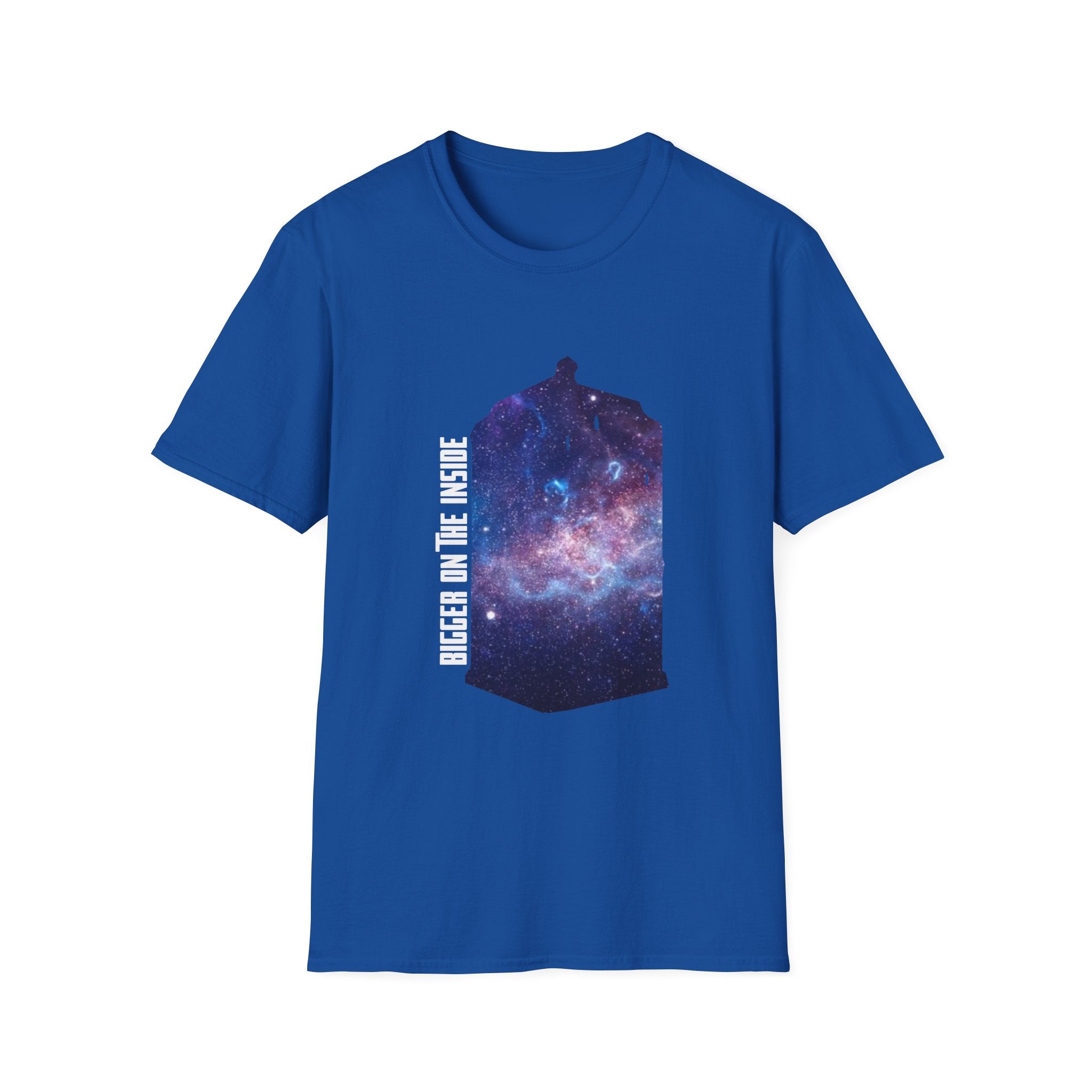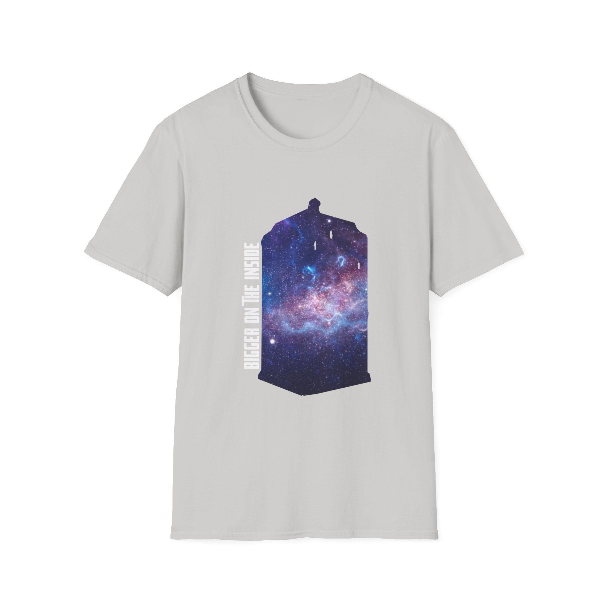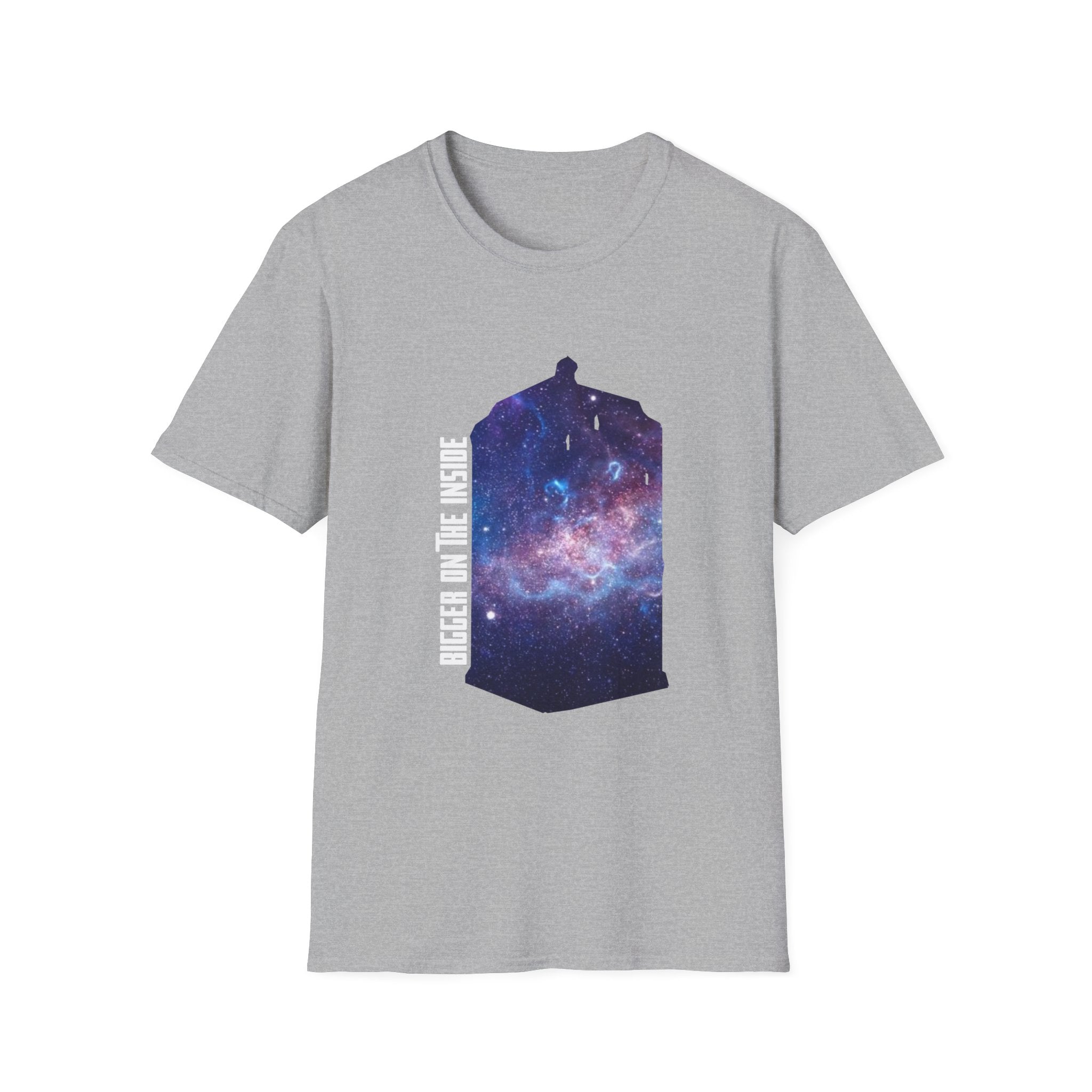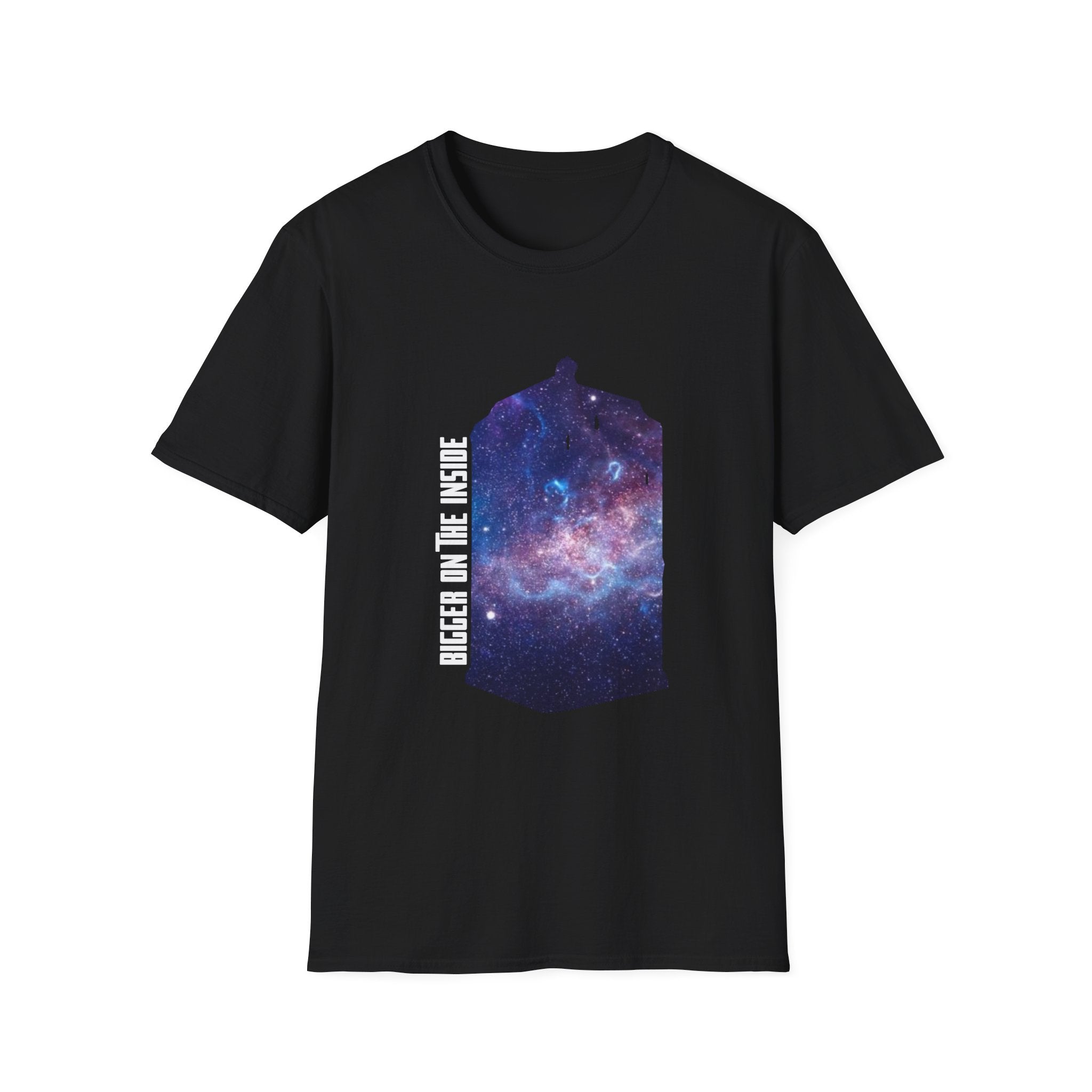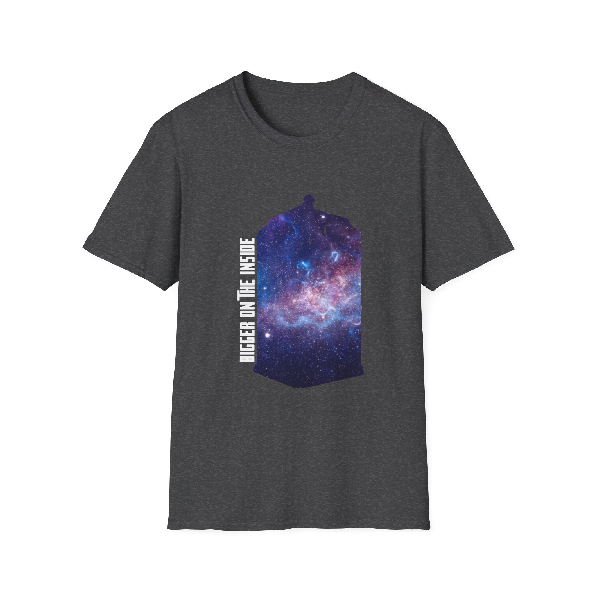 This "Bigger on the Inside" T-shirt is a tribute to the wonders of the universe, where what’s visible on the outside is only the beginning. Featuring a mesmerizing galaxy swirling into the iconic shape of a time-traveling phone box, this shirt captures the concept of infinite possibilities and hidden depths. With the phrase "Bigger on the Inside" boldly displayed, it's the perfect way to express your love for adventure, mystery, and all things beyond the ordinary. Whether you're a fan of sci-fi, space exploration, or just someone who appreciates a cool, cosmic design, this shirt is for you. Ideal for casual outings, fan events, or as a gift for those who dream of traveling through time and space.