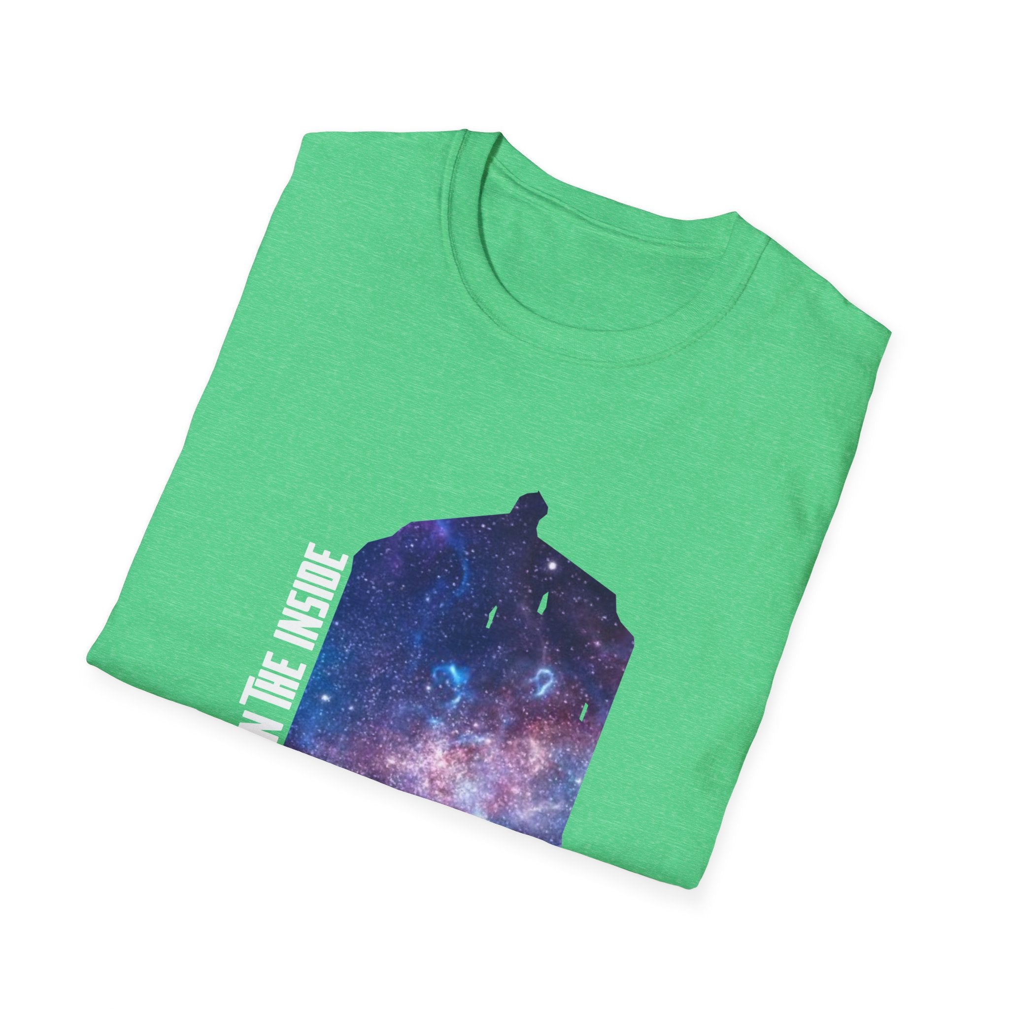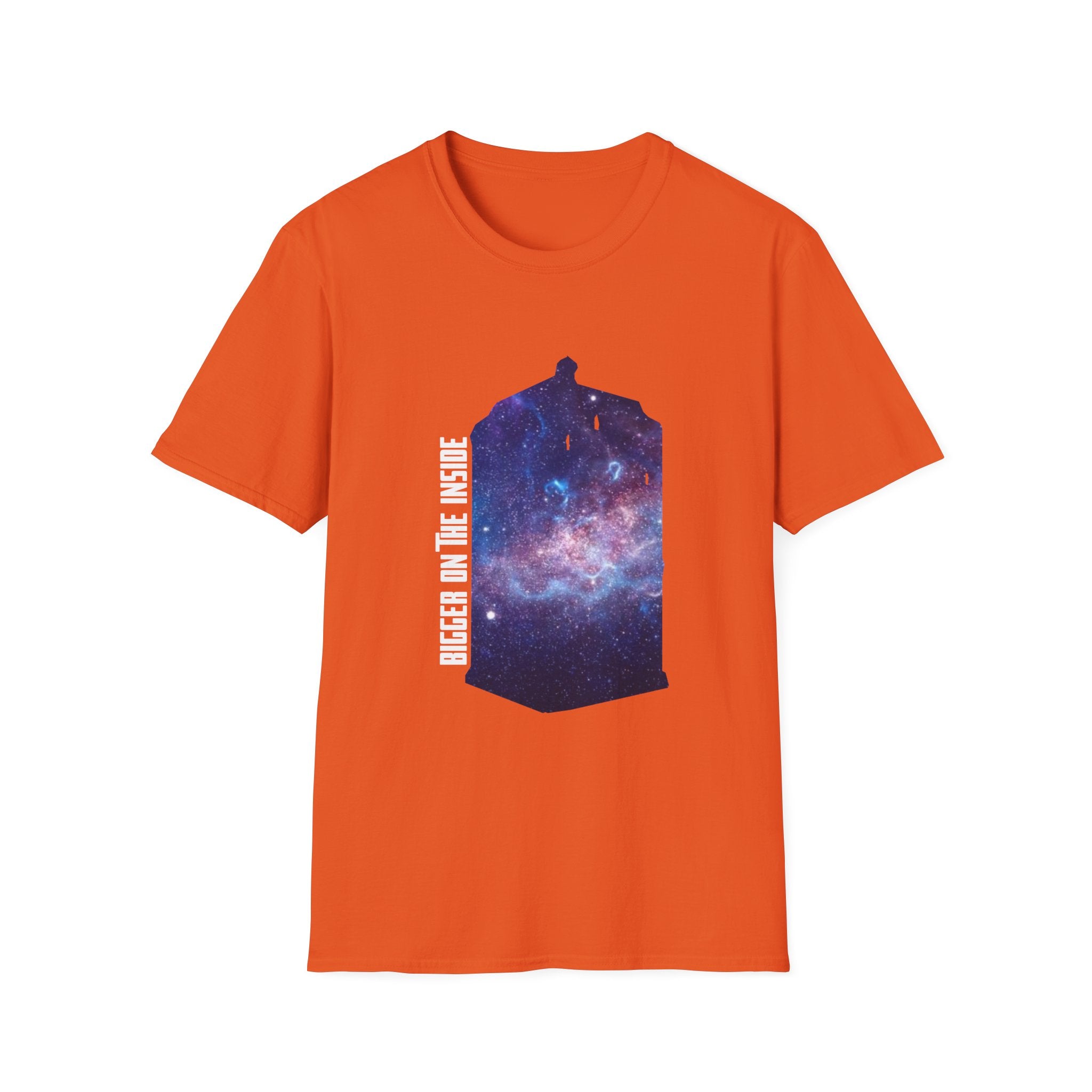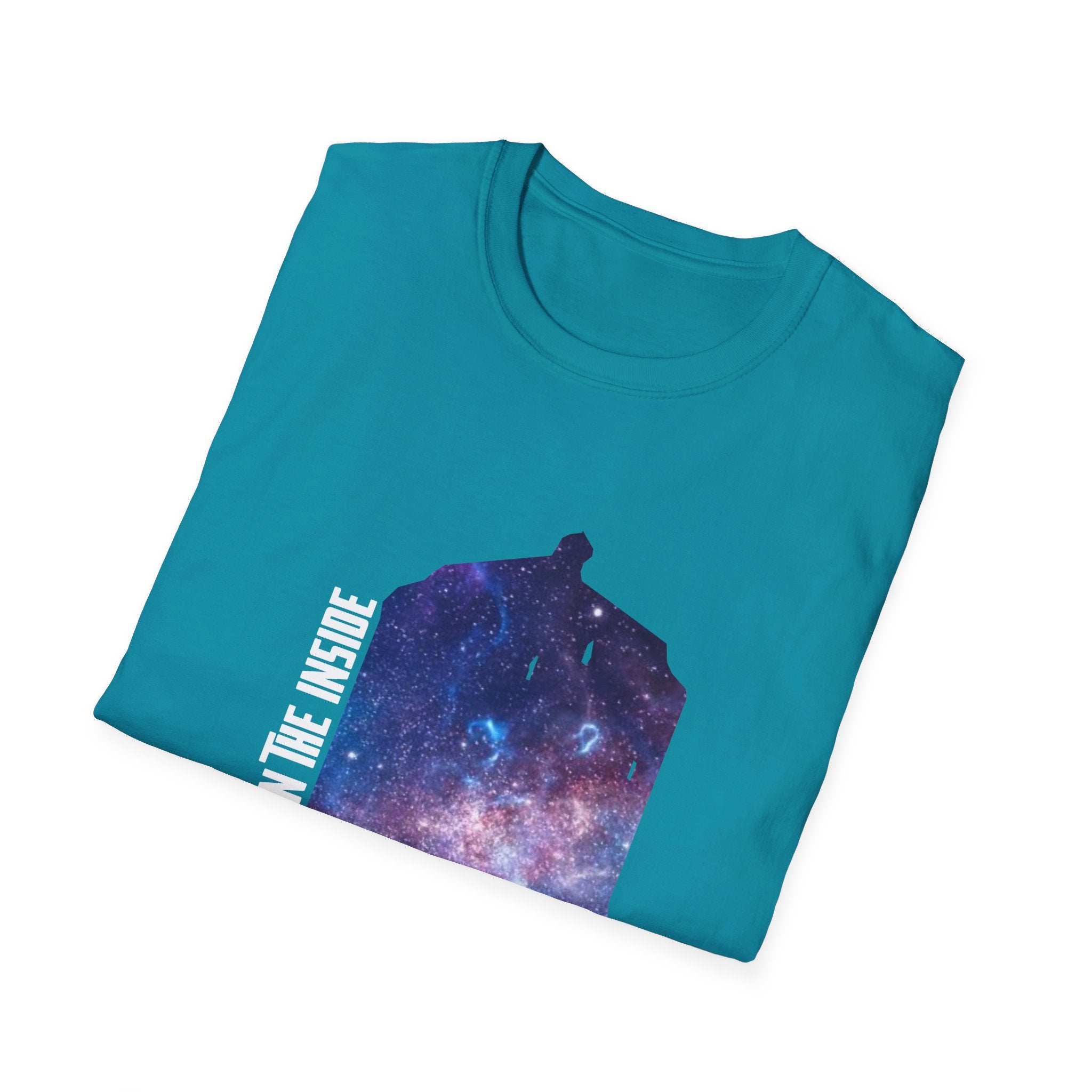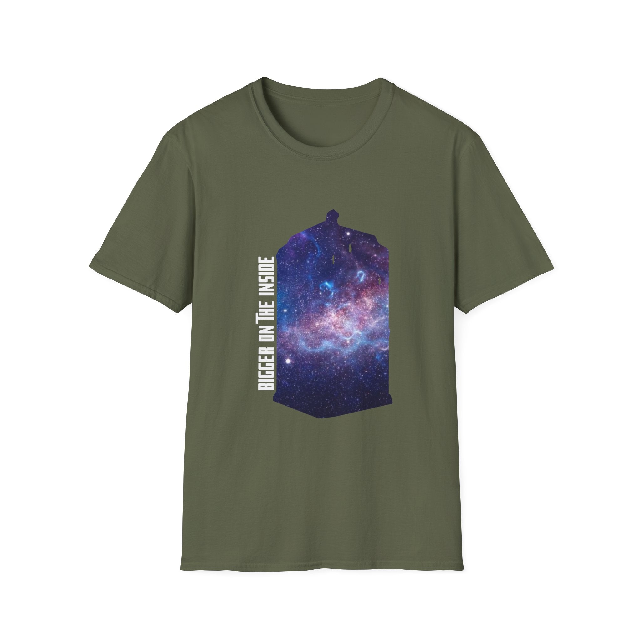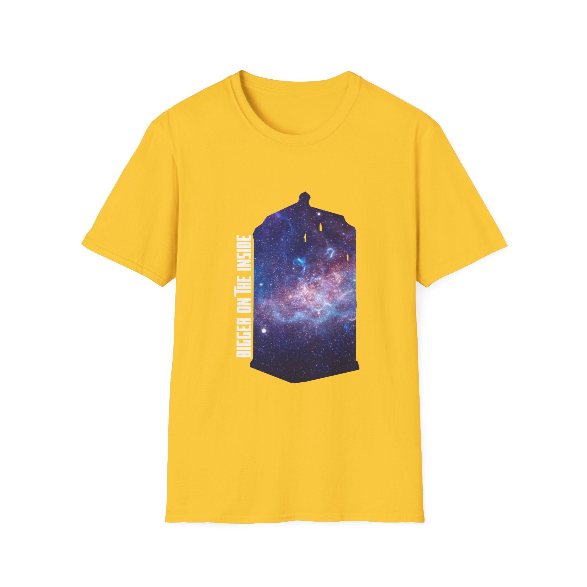 This "Bigger on the Inside" T-shirt is a tribute to the wonders of the universe, where what’s visible on the outside is only the beginning. Featuring a mesmerizing galaxy swirling into the iconic shape of a time-traveling phone box, this shirt captures the concept of infinite possibilities and hidden depths. With the phrase "Bigger on the Inside" boldly displayed, it's the perfect way to express your love for adventure, mystery, and all things beyond the ordinary. Whether you're a fan of sci-fi, space exploration, or just someone who appreciates a cool, cosmic design, this shirt is for you. Ideal for casual outings, fan events, or as a gift for those who dream of traveling through time and space.