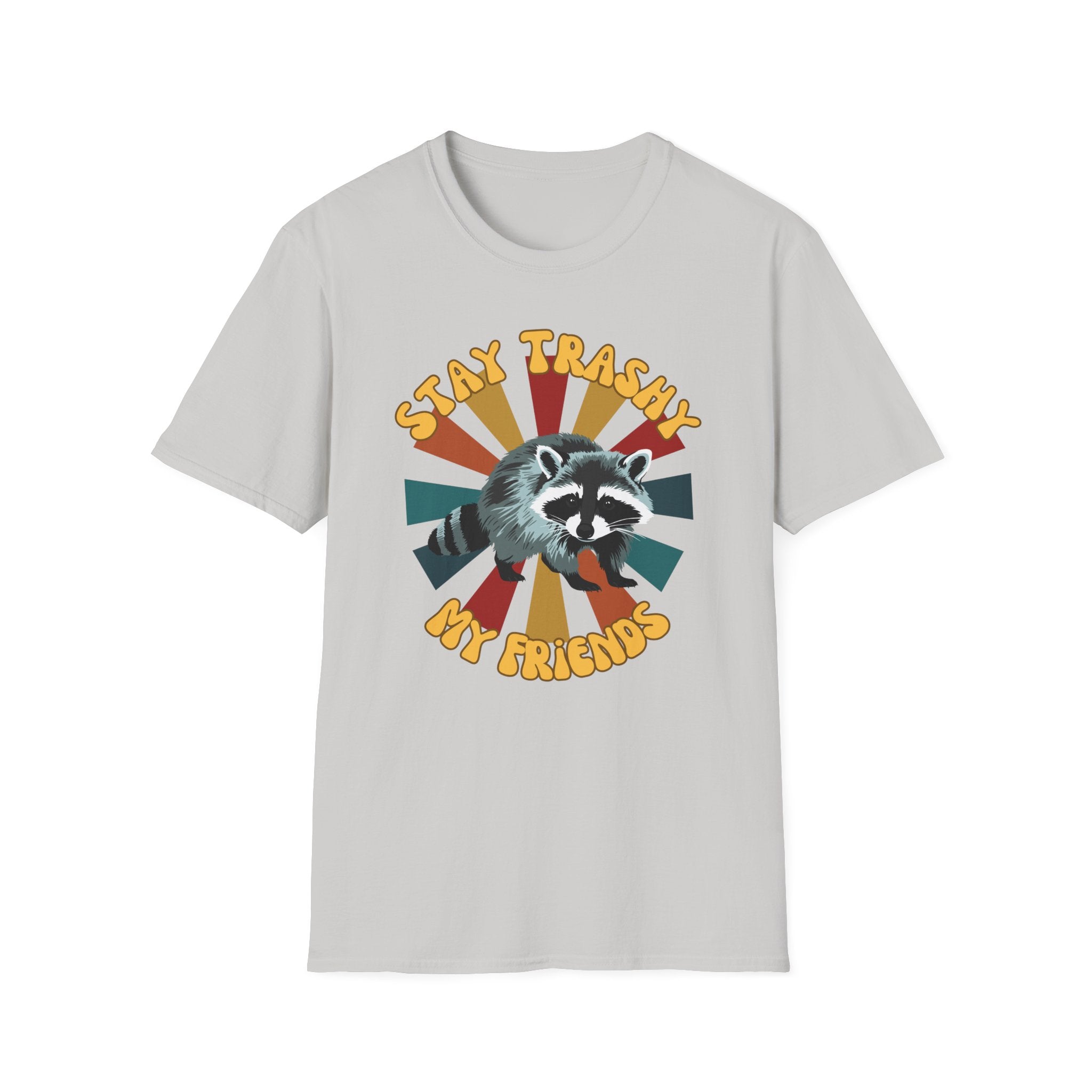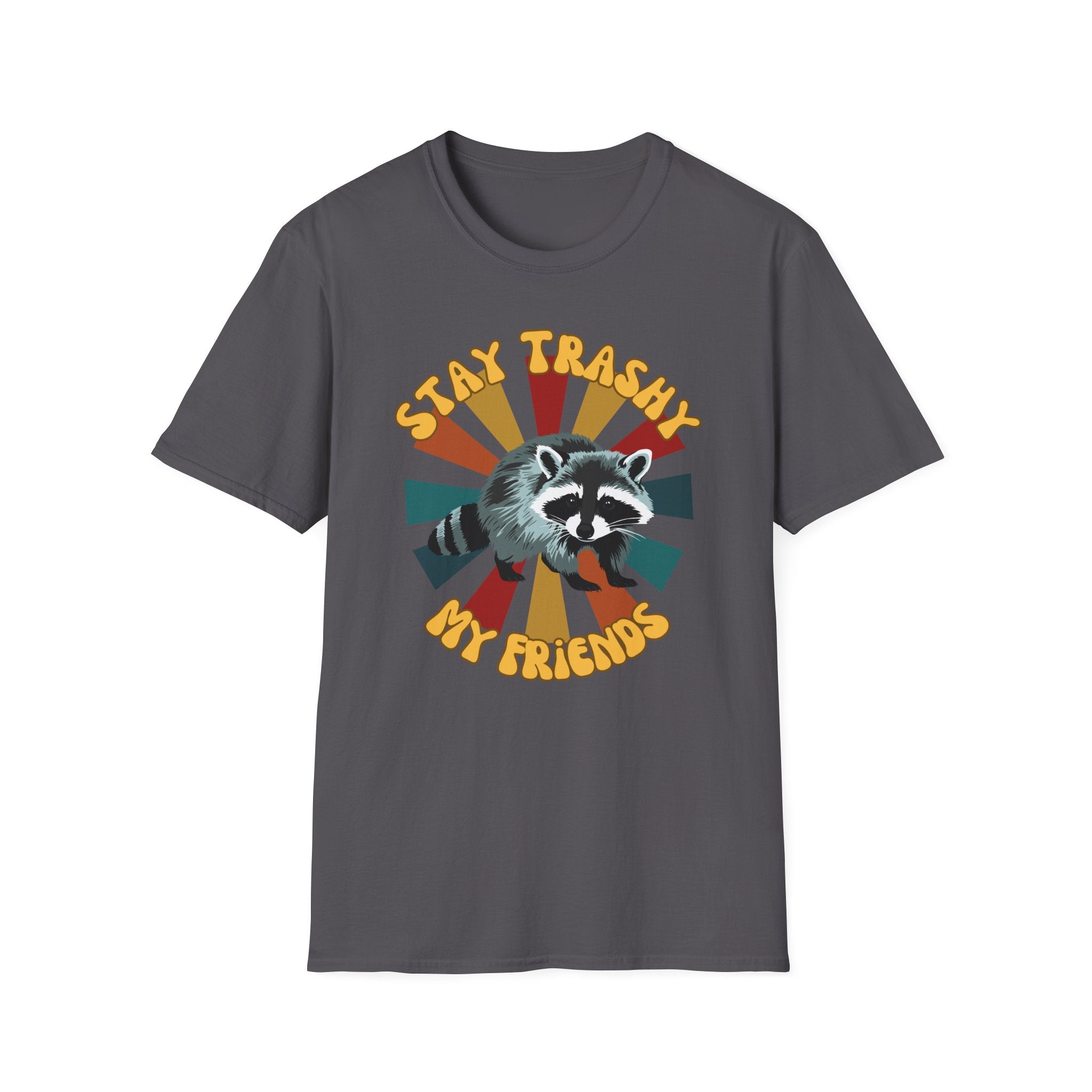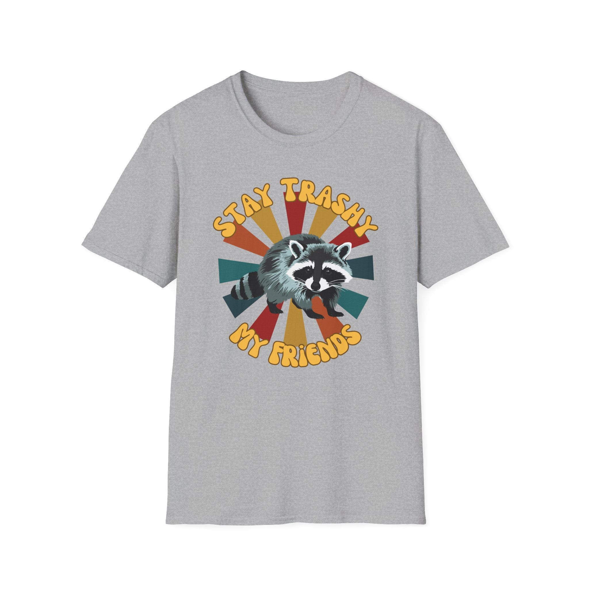 A unisex softstyle T-shirt featuring a design of a raccoon with text 'Stay Trashy My Friends'. This quirky and fun shirt is perfect for animal lovers and those who appreciate a bit of humor in their wardrobe. Ideal for casual wear or as a statement piece for a relaxed day out.