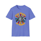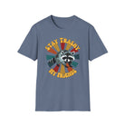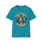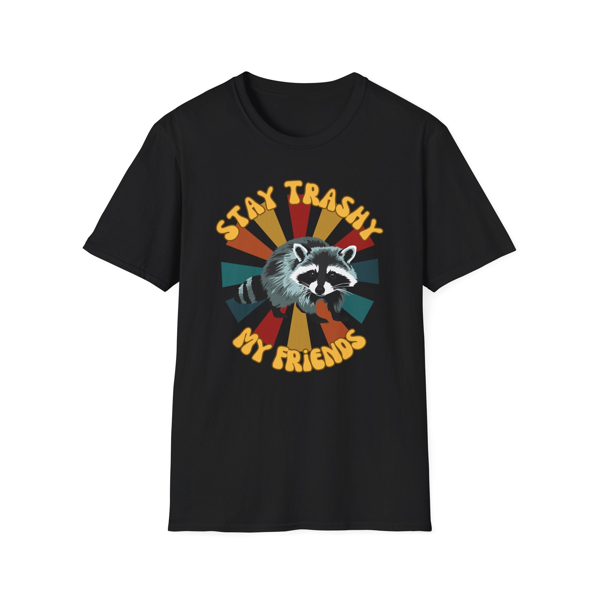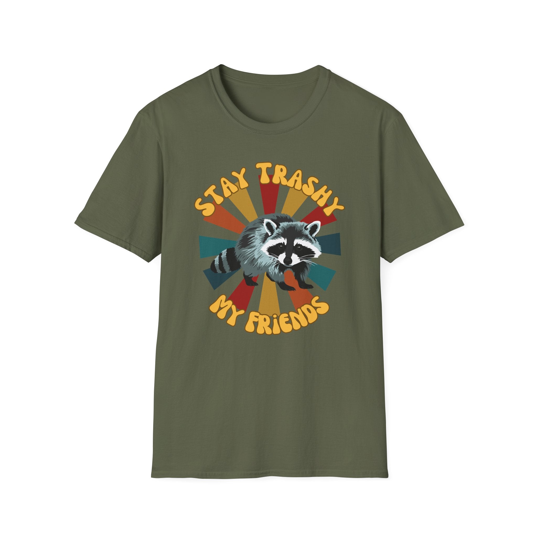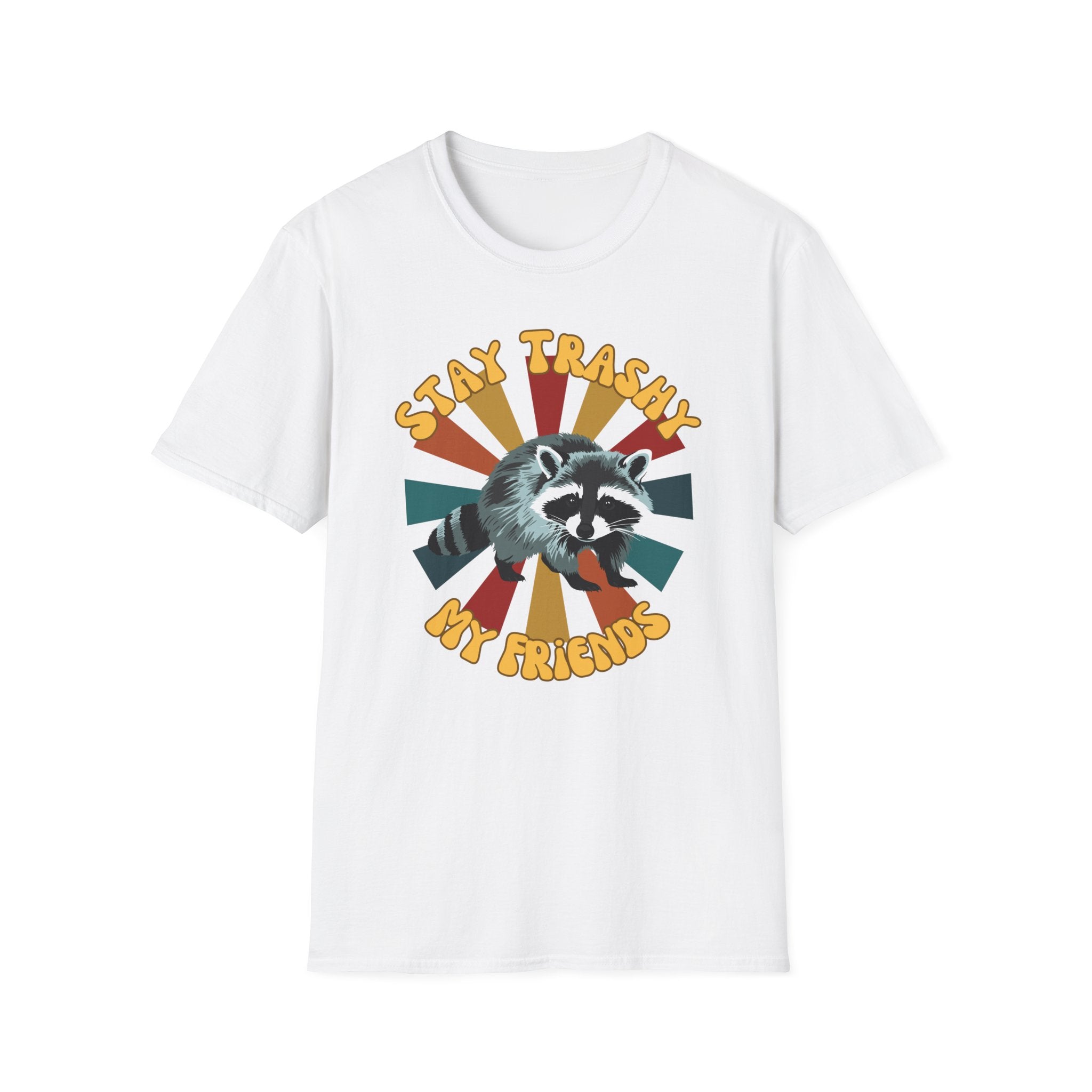 A unisex softstyle T-shirt featuring a design of a raccoon with text 'Stay Trashy My Friends'. This quirky and fun shirt is perfect for animal lovers and those who appreciate a bit of humor in their wardrobe. Ideal for casual wear or as a statement piece for a relaxed day out.
